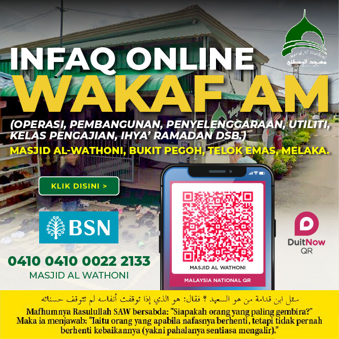 Sumbangan ini bertujuan bagi menampung kos operasi Masjid Al-Wathoni, Bukit Pegoh, Telok Emas, Melaka seperti utiliti (elektrik/air/unifi), penyelenggaraan dan operasi, pembangunan, majlis ilmu online, aktiviti dan program pengimarahan di Masjid Al-Wathoni, Bukit Pegoh, Telok Emas, Melaka.